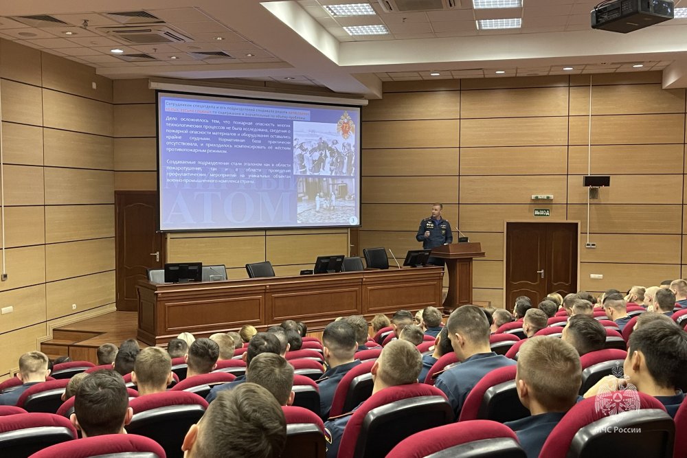 Заместитель начальника Управления Денис Кузнецов рассказал курсантам историю создания специальных подразделений ФПС по охране особо важных для национальной безопасности страны объектов, в частности про деятельность Специального управления ФПС № 72 МЧС России, обеспечивающего пожарную безопасность атомных станций России.