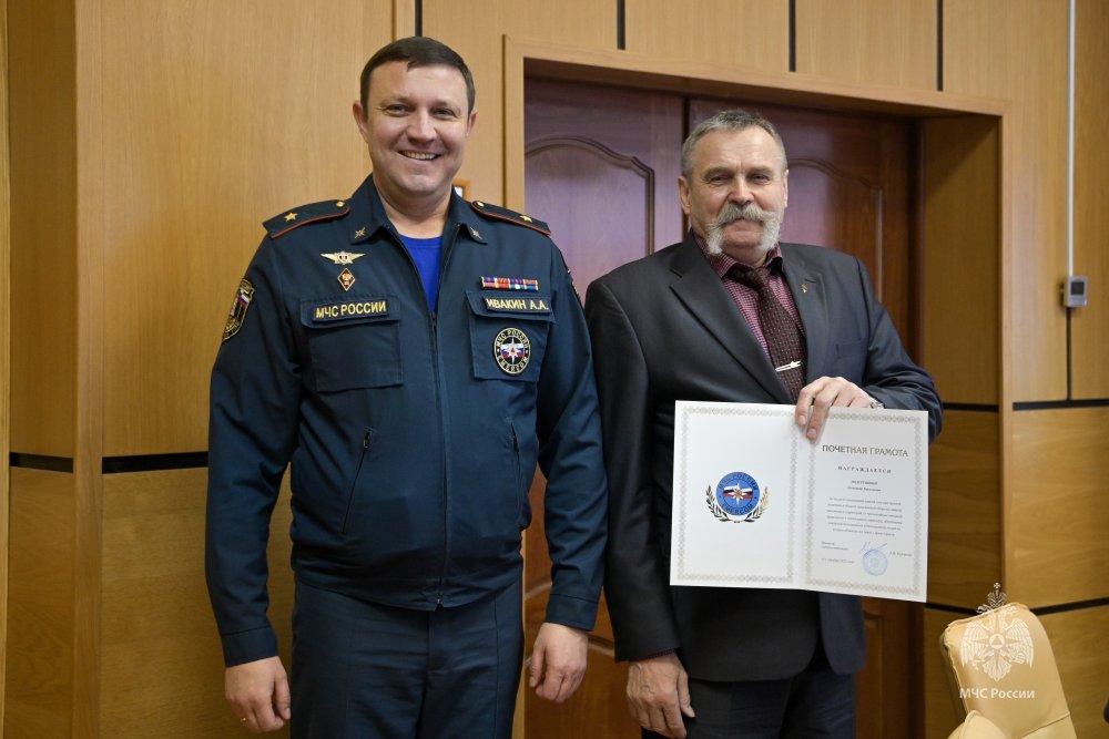 В первой части заседания совета в торжественной обстановке за заслуги в реализации единой государственной политики в области гражданской обороны, защиты населения и территорий от чрезвычайных ситуаций природного и техногенного характера, обеспечения пожарной безопасности и безопасности людей на водных объектах Почетной грамотой наградили профессора кафедры пожарной тактики и службы Александра Подгрушного.