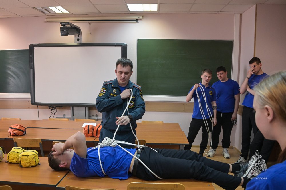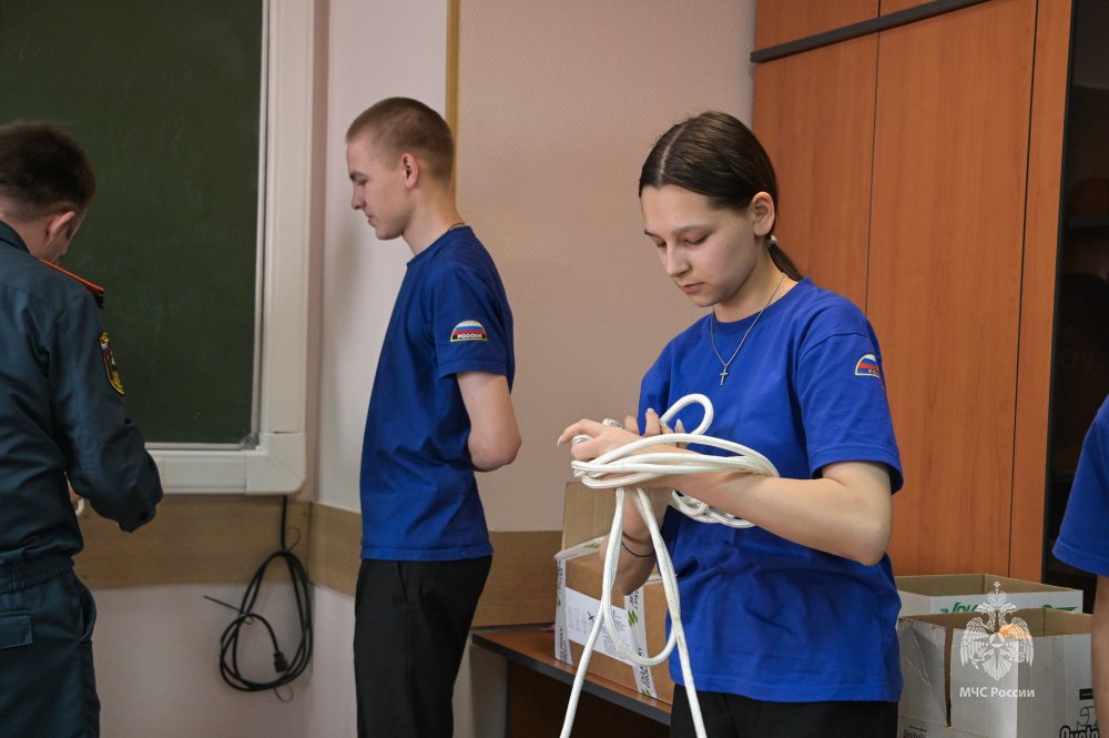 В ходе занятий по пожарно-строевой подготовке кадеты изучили составные части средств индивидуальной защиты органов дыхания и зрения и порядок их применения, а также отработали навыки по закреплению веревки за конструкцию и вязки двойной спасательной петли на пострадавшего.