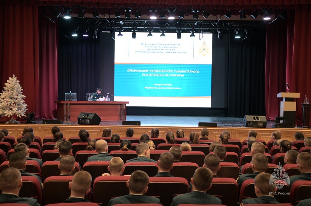 Советник Главы ведомства отметил, что только за прошедший год МЧС России приняло участие в мероприятиях по оказанию содействия в ликвидации последствий кризисных ситуаций на территории иностранных государств четыре раза. Он подробно рассказал обучающимся вуза об особенностях спасательных и гуманитарных операциях в Турции, Ливии, секторе Газа. Речь шла о пребывании сотрудников министерства в других странах, взаимодействии с принимающей стороной, организации быта, поддержании морально-делового климата в коллективе, сотрудничестве с волонтерскими организациями, а также учете в работе исторических, культурных и религиозных и этических особенностей пострадавшего государства.